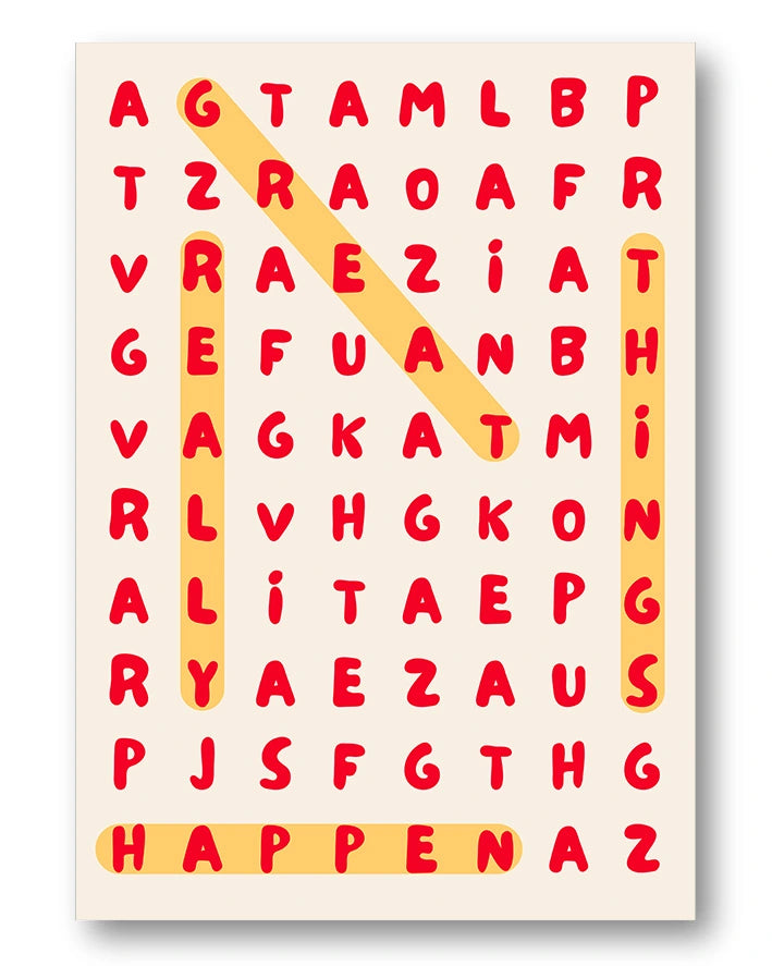 Dieses moderne Poster zeigt ein lebendiges Buchstabengitter, in dem die motivierende Botschaft „GREAT THINGS HAPPEN“ farblich hervorgehoben ist. Die Kombination aus kräftigem Rot und warmem Gelb erzeugt ein dynamisches, frisches Erscheinungsbild, das sofort ins Auge fällt. Das typografische Design wirkt verspielt und zugleich stilvoll – perfekt für Wohnzimmer, Büro, Flur oder kreative Arbeitsbereiche. Ideal für alle, die klare Typografie, Wortmuster und ausdrucksstarke Wandkunst lieben.